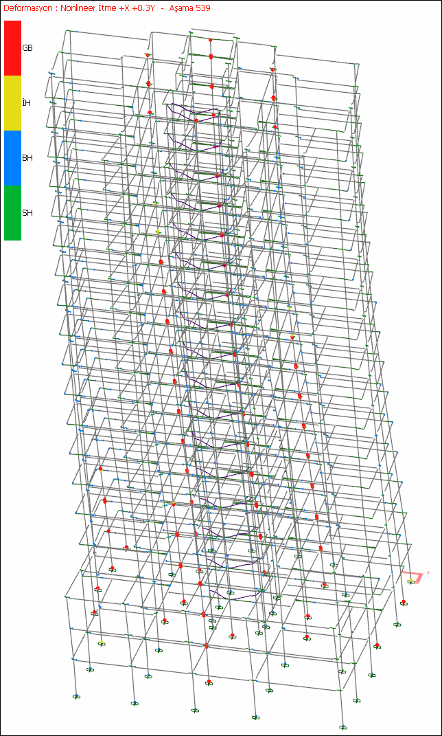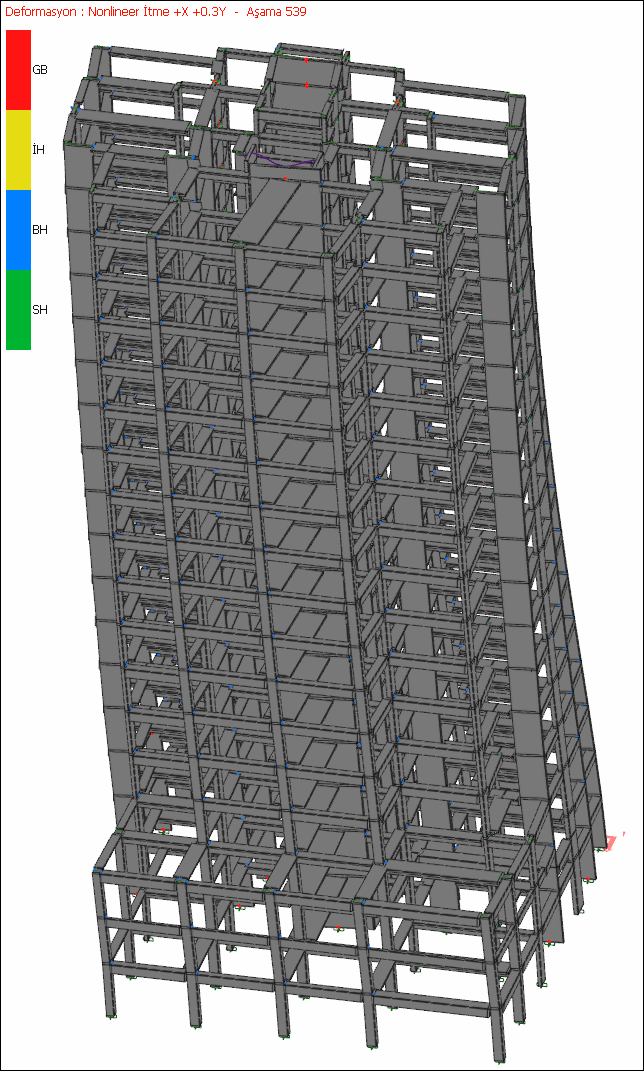Nonlineer İtme Analizi yapıldıktan sonra 3B görselleştirmede nonlineer itme analizi kombinasyonları seçilerek yer değiştirmeler ve hasar durumu renkli olarak gösterilir.