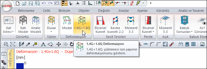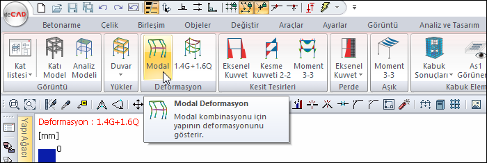 Ribbon menü Analiz ve Tasarım Görüntüleme sekmesi Deformasyon başlığı altından Modal veya 1.4G + 1.6Q komutlarından birine tıklayarak Deformasyon sekmesinden ulaşabilirsiniz.