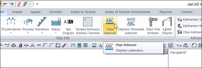 Obje adlandır komutuna ribbon menü Değiştir sekmesi Obje Edit başlığı altından ulaşabilirsiniz.