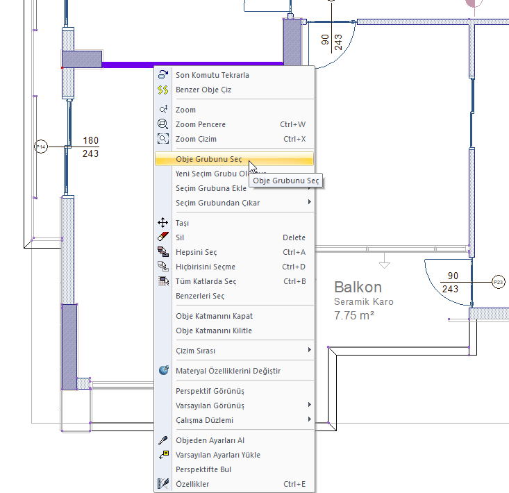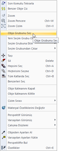 Seçilmek istenen gruba ait bir objeyi seçtikten sonra farenin sağ tuşu tıklandığında açılan menüden Obje Grubunu Seç komutuna ulaşabilirsiniz.
