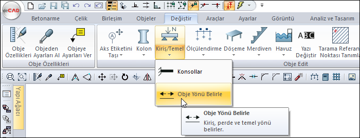 Obje Yönü Belirle komutu, kirişlerin ve sürekli temel kirişlerinin bakış yönlerini değiştirir. Kiriş bakış yönü, kiriş yazılarının yönlerinden anlaşılır.