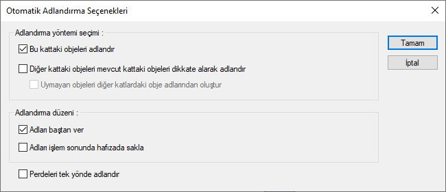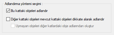 Adlandırma yöntemi seçimi ![]() Bu kattaki objeleri adlandır seçeneği ile sadece çalışılan kattaki objeleri adlandırır. Diğer kattaki objeleri mevcut kattaki objeleri dikkate alarak adlandır ile diğer katlarda bulunan elemanlar, çalışılan kattaki elemanlar ile aynı olacak şekilde adlandırır. Uymayan objeleri diğer katlardaki obje adlarından oluştur ile obje adlandırma yapılırken söz konusu elemanın diğer katlardaki pozisyonuna bakılır. |