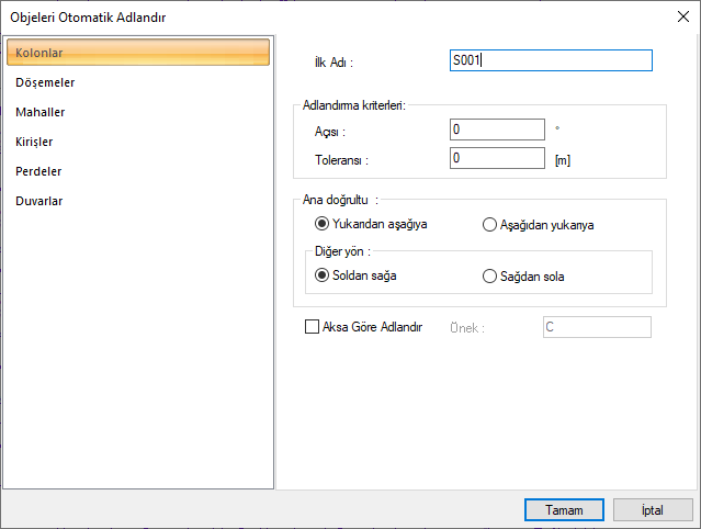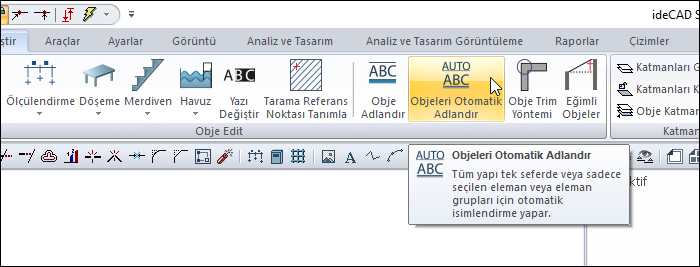 Objeleri otomatik adlandır komutuyla, tüm yapı tek seferde veya sadece seçilen obje/obje grupları adlandırılır. Her obje grubuna ait ayrı adlandırma ayarları bulunur. Mimari ve statik projeye uygun olarak ayarlar düzenlenir.
