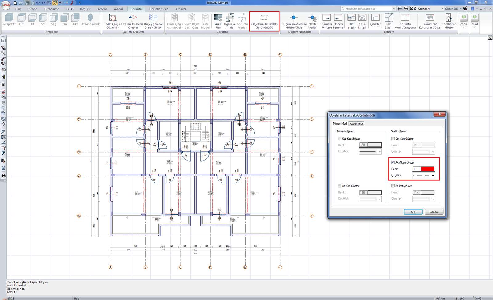 Menüde Görüntü bölümünde bulunan "Objelerin katlardaki görünürlüğü" özelliği ile aktif katta, üst ve alt kattaki mimari ve statik objelerin görünüp görünmeyeceği, bununla birlikte görünümün hangi çizgi tipleriyle yapılacağı ayarlanır.