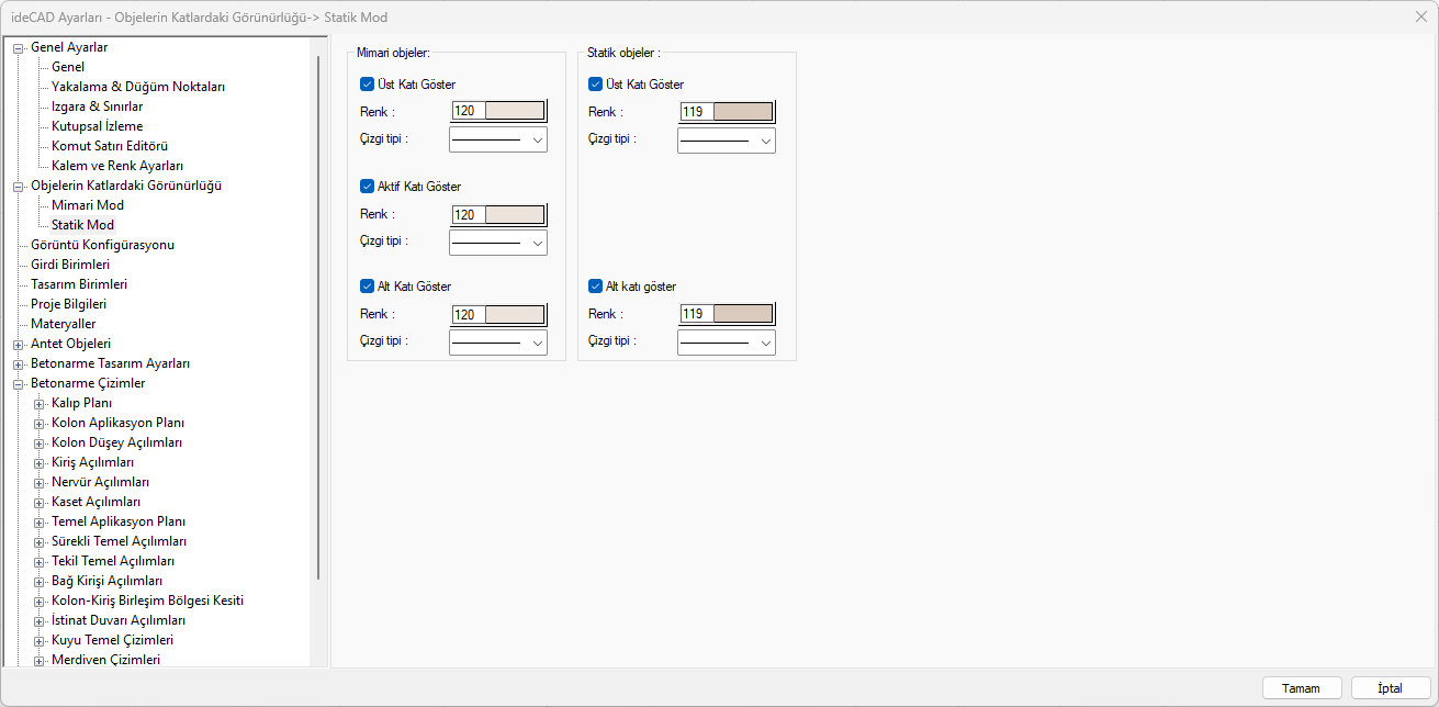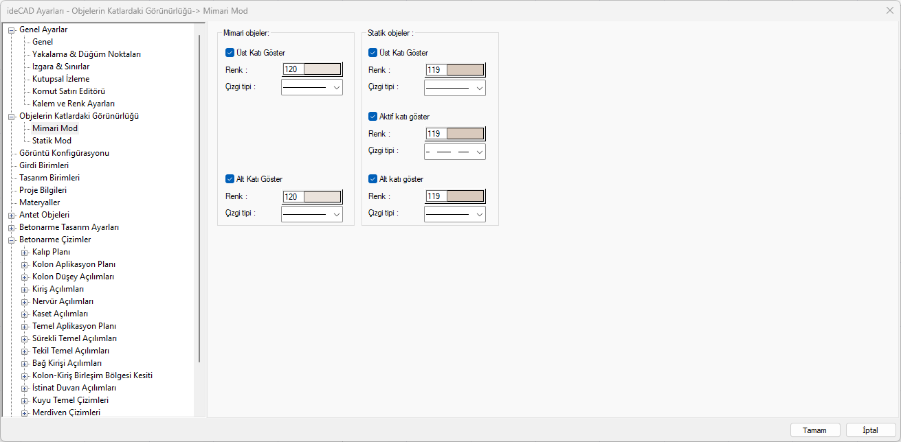 Alt ve üst katlardaki objelerin izlerinin gösterilip gösterilmeyeceği, gösterim çizgi tipi ve renkleri ayarlanır.