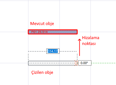 Kiriş, perde, duvar, çizgi gibi objeler çizilirken; ilk nokta verildikten sonra klavyeden shift tuşu basılı tutulup, önceden çizilmiş olan başka objenin düğüm noktası referans alınarak, o noktaya göre hizalama yapılır.