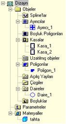 Sağ alt köşedeki Tasarı Takip penceresidir. Bu pencerede yarattığınız bütün objeleri hiyerarşik bir yapı içerisinde görebilir. Bu objelerin isimleri üzerine çift tıklayarak objelerin özelliklerine ulaşabilir veya Del/Delete tuşuna basarak objeleri silebilirsiniz.