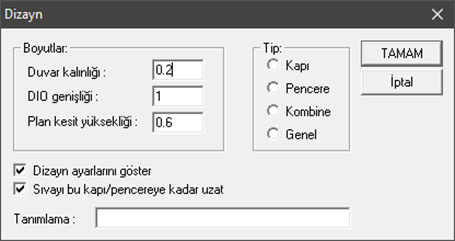 Kapı-pencere tasarımı için gerekli dizayn ayarları yapılır. Bu ayarlar aynı zamanda Ayarlar menüsünde teker teker yer almaktadır.
