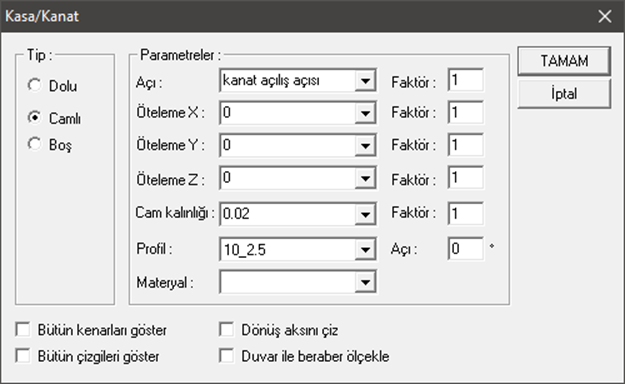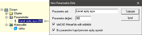 Eğer parametre açılış açısıysa Bu Parametre kapı/pencere açılış açısıdır seçeneğini işaretleyin.
