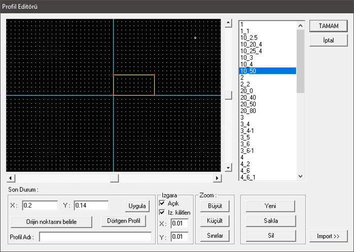 Konstrüksiyon/Profil Editörü satırını tıkladığınız da karşınıza profil editörü gelecektir. Bu editör ile profiller üzerinde değişiklik yapabilir veya yeni profiller yaratabilirsiniz.