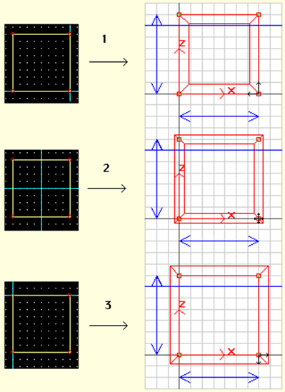 Eğer profilin orijin noktası üst köşelerden birisi olarak tanımlanırsa kasa kenarları düğüm noktalarından dışarı doğru uzayacaktır. Kasanın belirlenen ölçülerden profilin Y ekseni kadar büyük olmasına neden olacaktır. 3 numaralı örnekte görülebilir.