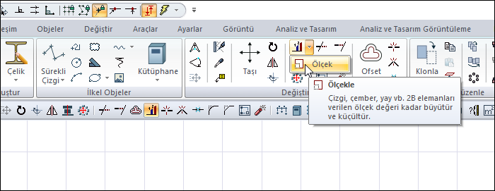 Ölçek/Ölçekle komutlarına ribbon menü Çizimler sekmesi Değiştir başlığı altından ulaşabilirsiniz.