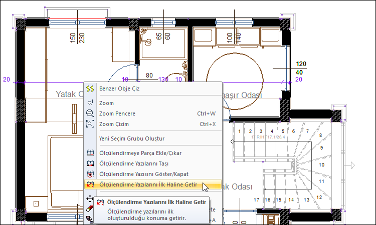 İlk haline döndürmek istediğiniz ölçülendirmeyi seçin farenin sağ tuşuna tıklayarak açılan menüden Ölçülendirme Yazılarını İlk Haline Getir satırına tıklayın.