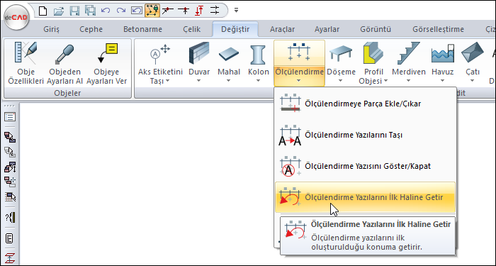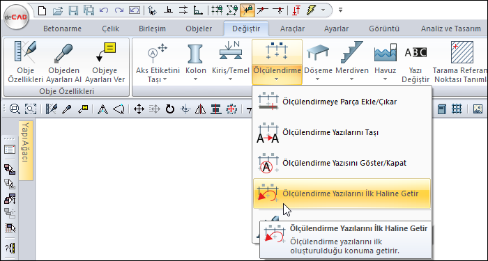 Ölçülendirme Yazılarını İlk Haline Getir komutu, ölçülendirme üzerinde yapılan değişikleri tek seferde iptal eder ve ilk haline getirir.