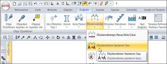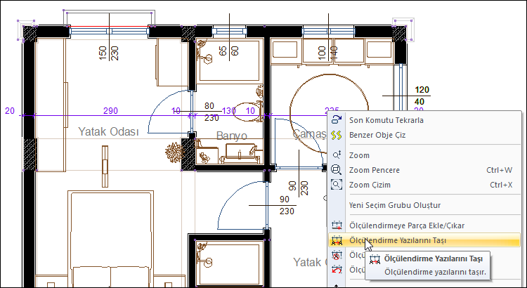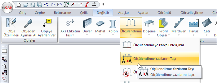 Farenin sağ tuşunu tıkladıktan sonra açılan listeden Ölçülendirme Yazılarını Taşı satırını ya da ribbon menüde Ölçülendirme Yazılarını Taşı ikonunu tıklayın.