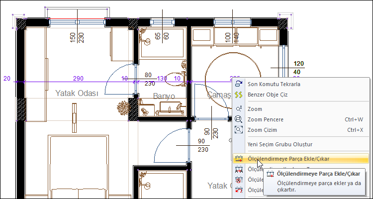 Ekleme/Çıkarma yapmak istediğiniz ölçülendirmeyi seçin farenin sağ tuşuna tıklayarak açılan menüden Ölçülendirmeye Parça Ekle/Çıkar satırına tıklayın.