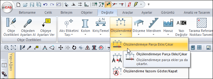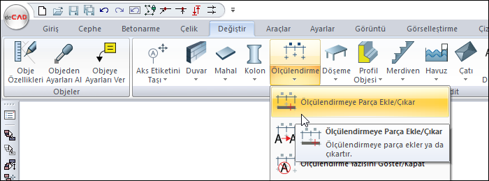 Ölçülendirmenin üzerindeyken farenin sağ tuşunu tıkladıktan sonra açılan listeden Ölçülendirmeye Parça Ekle/Çıkar satırını ya da ribbon menüde Ölçülendirmeye Parça Ekle/Çıkar ikonunu tıklayın.