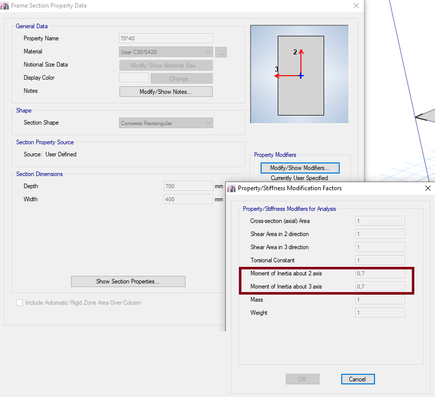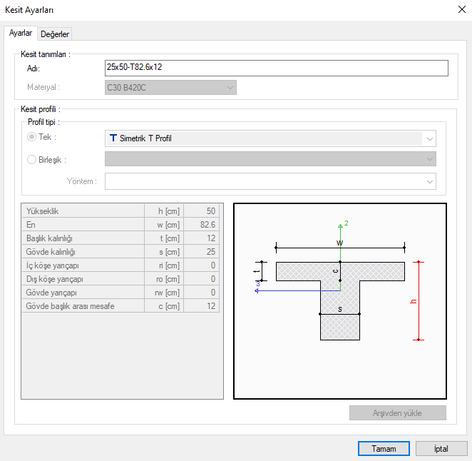 b- Kesit tanımlaması için dikkat edilmesi gereken nokta; tam rijit diyafram seçiminde ideCAD Statik tablalı kiriş kesiti kullanır. Bu durumun ETABS ile de oluşturulması gerekmektedir. Etkin kesit rijitliği çarpanları girilmelidir.