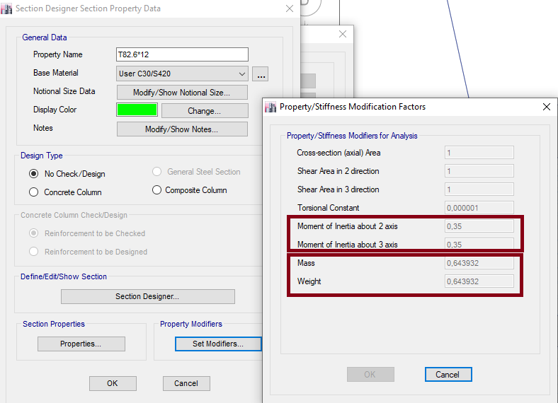Betonarme kiriş tablalı girilmeli ve kütle hesabının iki program arasında aynı olması adına ETABS’ de tabla kısımlarına ait oran aşağıdaki görselde olduğu gibi yazılmalıdır. Oran hesaplanırken, dikdörtgen kesitin alanı / tablalı kesitin alanı kullanılır.