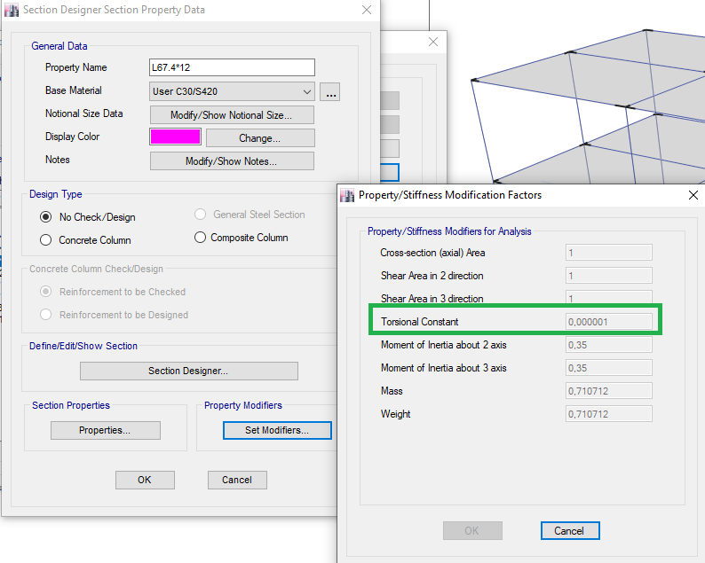 Dikkat edilmesi gereken bir diğer husus, ideCAD Statik' de kirişler için uygunluk burulması işaretli ise ETABS’de set modifiers bölümünde aşağıdaki görselde göreceğiniz ‘torsional constant’ bölümüne müdahale edilmelidir. 10(-6) yazılması gerekmektedir.