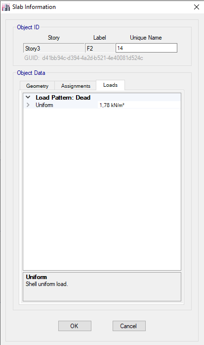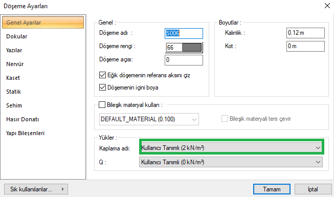 Döşeme malzemesi için birim hacim ağırlık 0 girilmiş, modelde yükleme sırasında döşeme üzerine alan yayılı yükü olarak eklenmiştir.