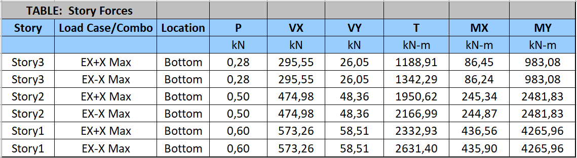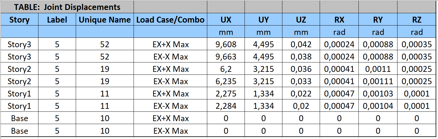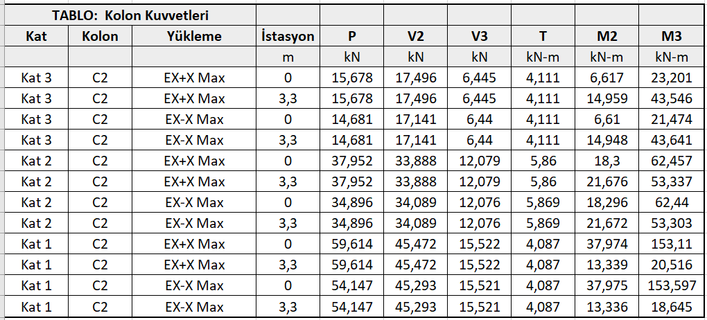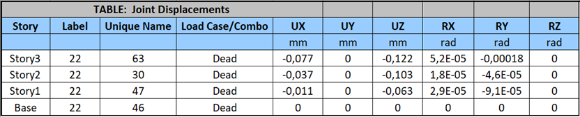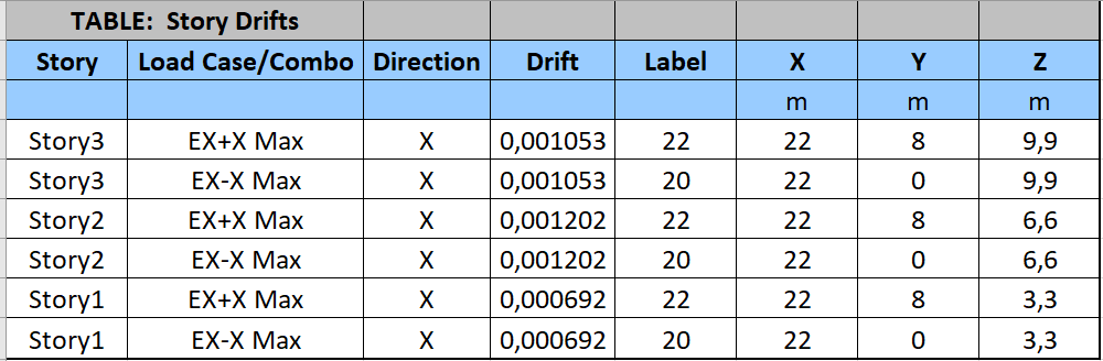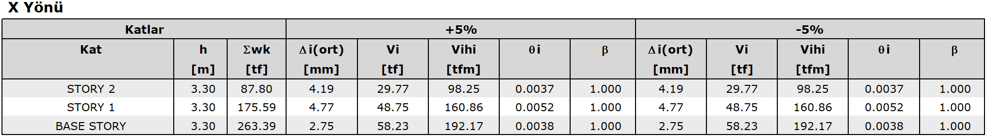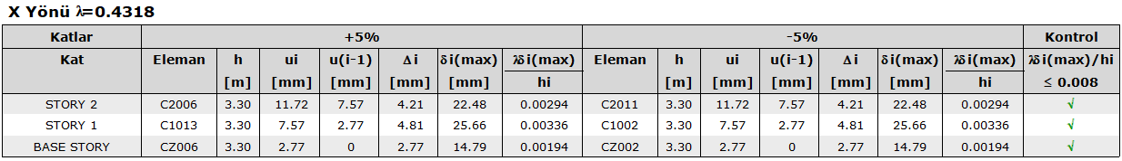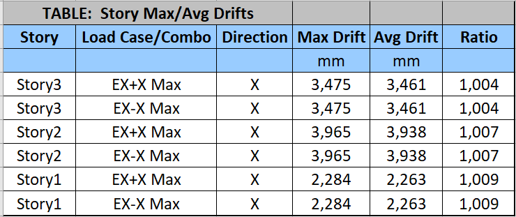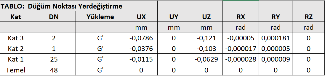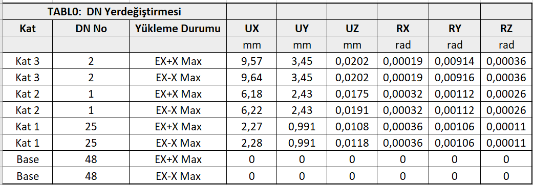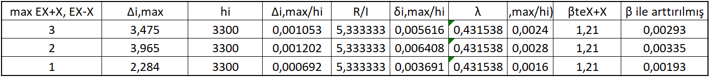 ETABS’ de kat maksimum/ortalama öteleme tablosunda maksimum öteleme değerleri, kat yüksekliğine bölünerek kat göreli öteleme tablosundaki değerler elde edilir. Örneğin; 3,475 mm öteleme kat yüksekliği olan 3.3 m’ye bölünerek 0,001053 elde edilmektedir. ETABS’ den elde edilen bu değerler Göreli Kat Ötelemelerin Sınırlandırılması için hesaplanır.