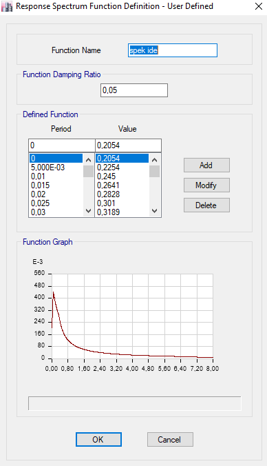 ideCAD Statik yönetici olarak çalıştırınız. Bir defa projeyi analiz ediniz. Alt araç çubuğunda yer alan komut satırına exportspectrum yazınız. Bilgisayarında c klasöründe yer alan program files - ideCAD v10 klasörüne gidiniz. exp_spec.txt isimli bir txt dosyası göreceksiniz, bu dosyayı dışarı alınız. ideCAD ondalık sayılar için nokta ile çalışır, ETABS bilgisayarınızda virgül veya nokta hangisine ayarlı ise txt dosyasını ona göre düzenleyiniz. Ardından ETABS - Functions -User Defined seçili iken exp_spec isimli dosyayı import ediniz.