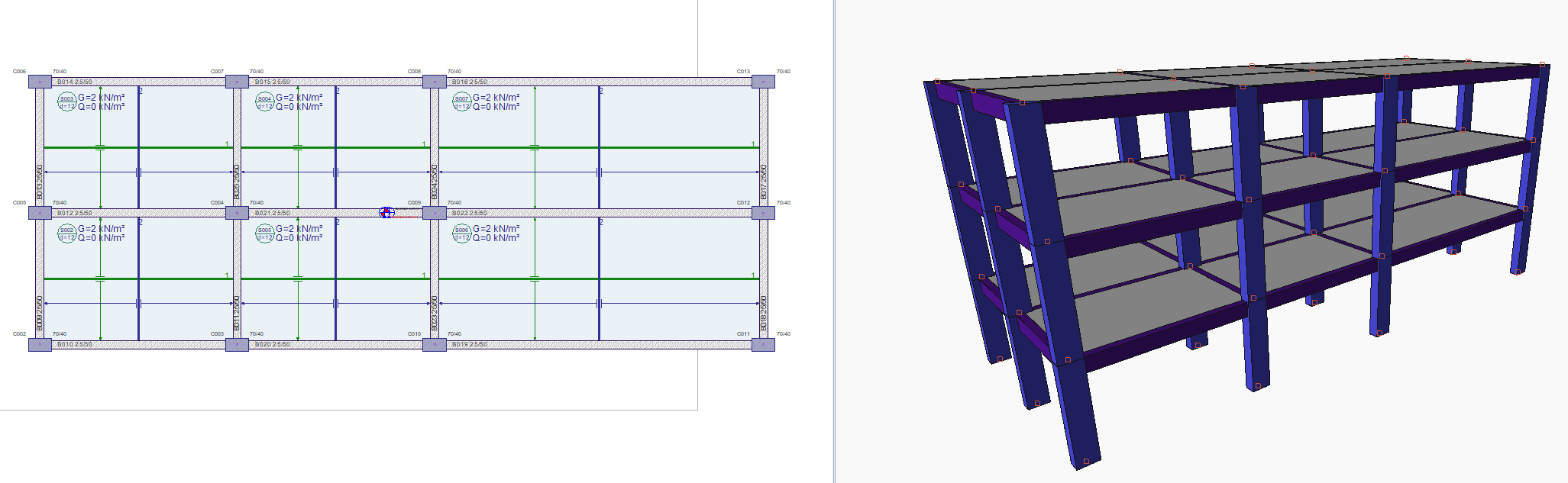 Yukarıda plan ve 3d görüntüsünü gördüğünüz betonarme yapı X yönünde 2 adet 6 m ve 10 m olmak üzere 3 açıklıktan oluşmakta iken Y yönünde 2 adet 4 m açıklığa sahiptir. Betonarme moment aktaran çerçeve ve yarı rijit diyafram olarak modellenen yapı dinamik ek dışmerkezlik yöntemine uygun olarak dinamik (modal) analiz ile çözülerek ve mod birleştirme yöntemi ile deprem etkileri tespit edilecektir. ETABS ile karşılaştırılmalı model ve sonuç incelemesi aşağıdadır.