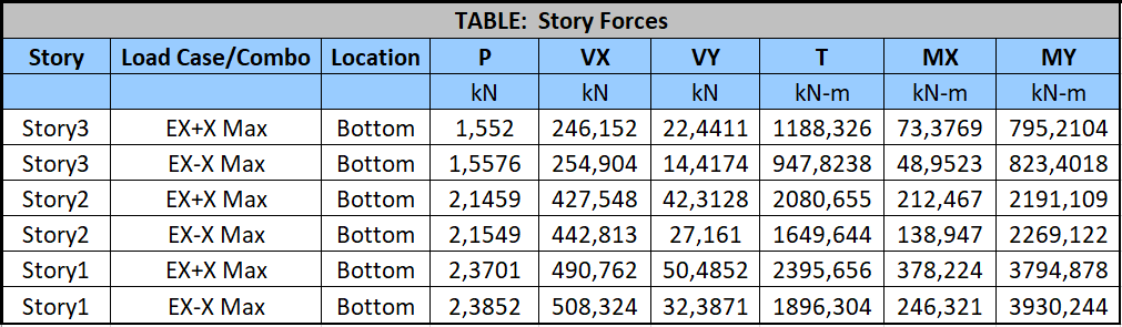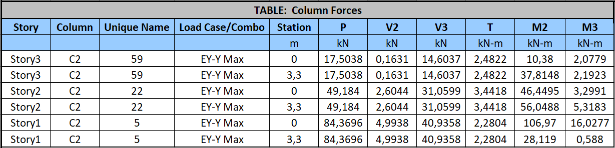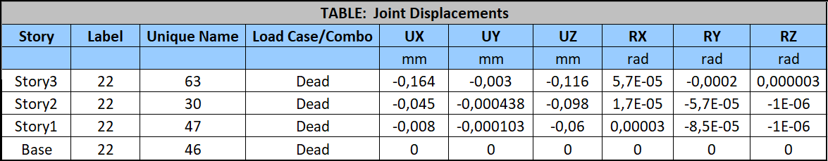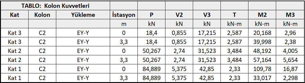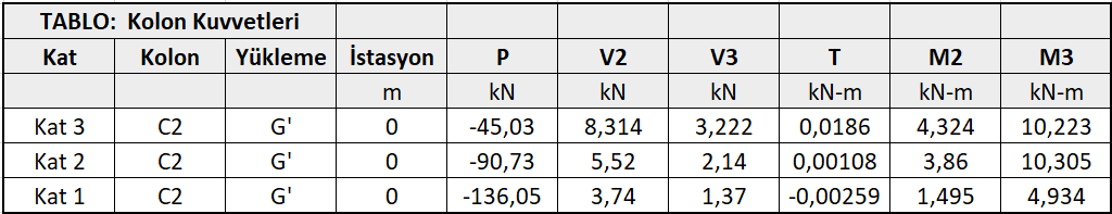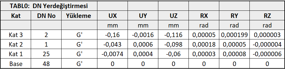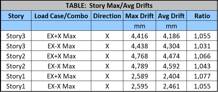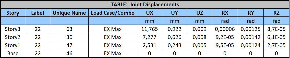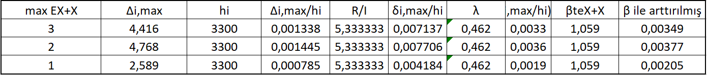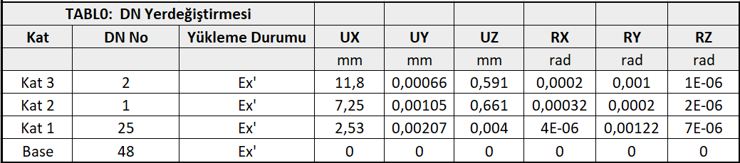 ETABS’ da kat maksimum/ortalama öteleme tablosunda maksimum öteleme değerleri, kat yüksekliğine bölünerek kat göreli öteleme tablosundaki değerler elde edilir. Örneğin; 3,475 mm öteleme kat yüksekliği olan 3.3 m’ye bölünerek 0,001053 elde edilmektedir. ETABS’ den elde edilen bu değerler Göreli Kat Ötelemelerin Sınırlandırılması için hesaplanır.