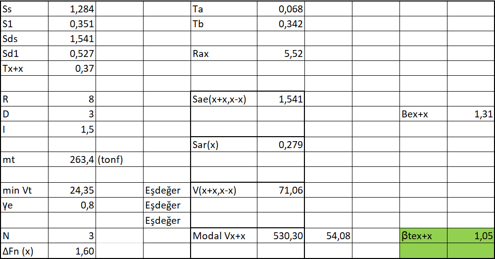 Eşdeğer Büyütme Katsayısı sayfasında TBDY 2018 gereği yapılan bu hesaba ait detaylar mevcuttur. ETABS ile bu katsayı hesabını doğrudan yapmamaktadır, bu nedenle ETABS’dan elde edilen modlara ait periyodlar kullanılarak eşdeğer deprem yükü elle belirlenecektir. Eşdeğer deprem yükünün belirlenmesinde kullanılan adımlar için bknz:Eşdeğer Deprem Yükü Yöntemi ve Azaltılmış Tasarım İvme Spektrumu