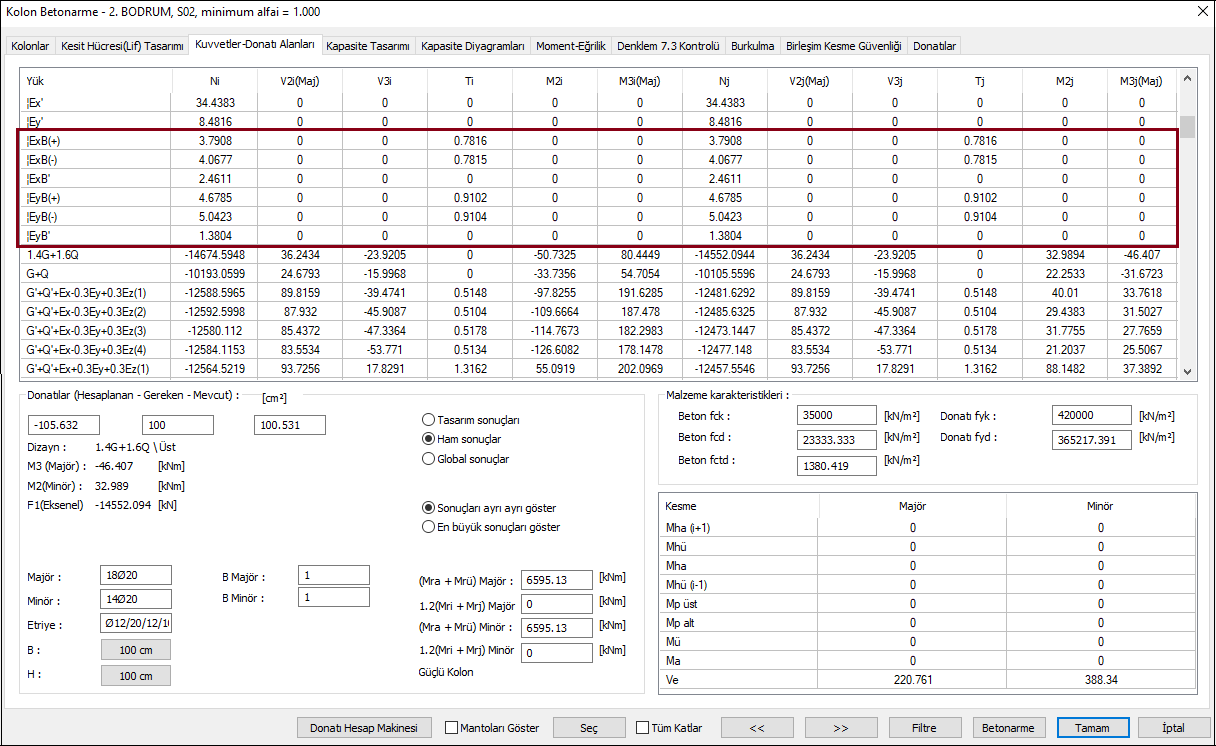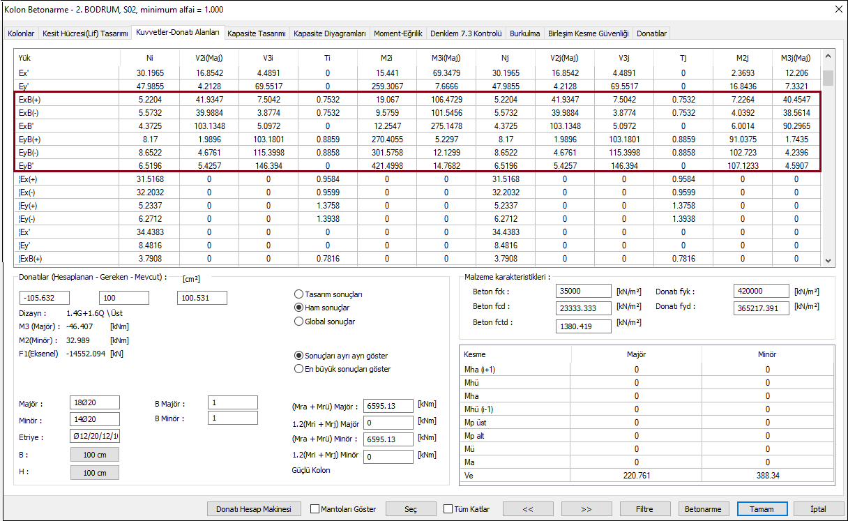İkinci yükleme durumu, monolitik çözüm iç kuvvet sonuçları aşağıdaki gibidir. Örnek olarak 2. bodrum kat S02 kolonu kullanılmıştır. Alt bölüm elemanı olan bu kolonda tasarıma esas iç kuvvetleri belirleme de birinci yükleme ve ikinci yükleme durumlarına ait sonuçlar kullanılacaktır.