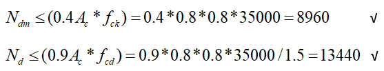 TBDY 7.3.1.2 gereği kolonun brüt enkesit alanı, Ndm TS 498’de tanımlanmış olan hareketli yük azaltma katsayıları da dikkate alınarak, G ve Q düşey yükleri ile E deprem etkisinin ortak etkisi altında G+Q+E yükleme durumunda hesaplanan eksenel basınç kuvvetlerinin en büyüğü kullanılarak Ac≥Ndm/(0.40fck) koşulunu sağlamalıdır. Aynı zamanda TS 500 7.4.1 kontrolününde sağlaması gerekir.