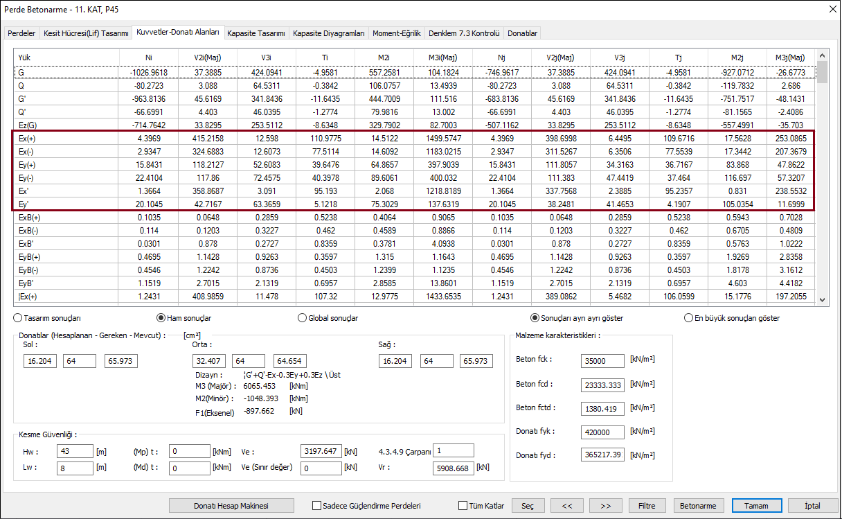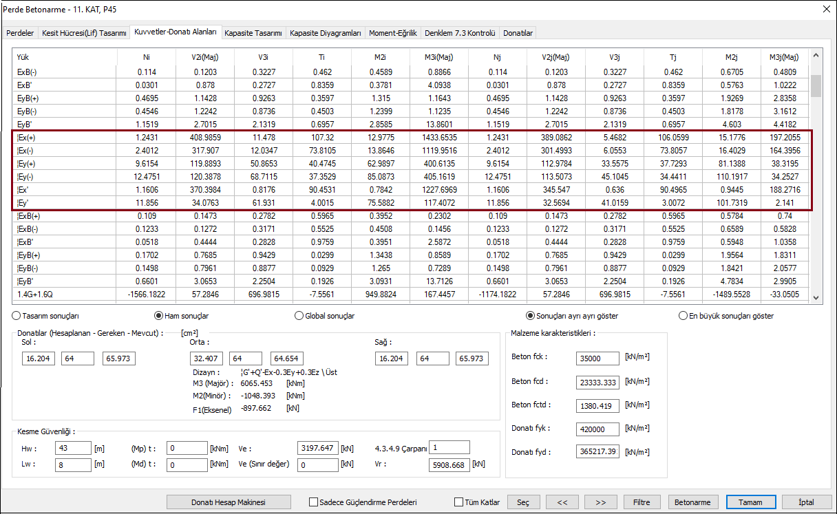 Birinci yükleme durumu için monolitik çözüm iç kuvvet sonuçları aşağıdaki gibidir. Örnek olarak 11.kat P45 perdesi kullanılmıştır. Üst bölüm elemanı olan bu perdede tasarıma esas iç kuvvetleri belirlemede sadece birinci yükleme durumuna ait sonuçlar kullanılacaktır.