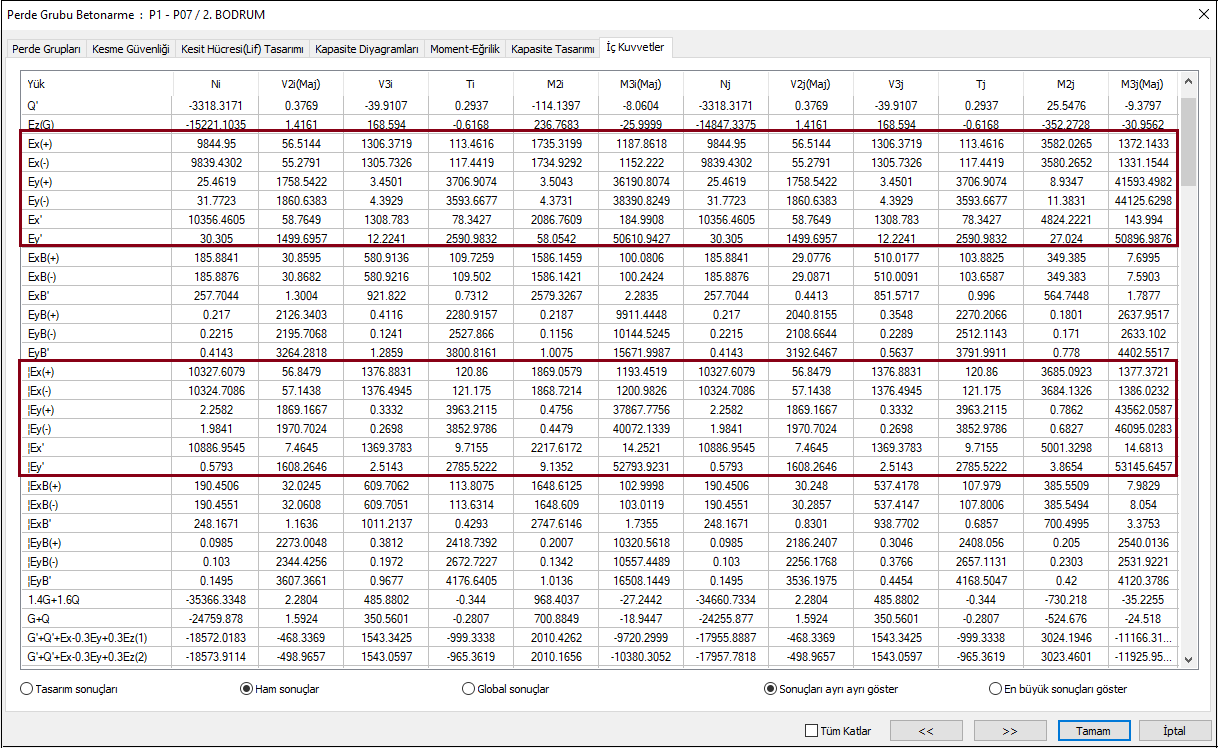 2.Bodrum kat çekirdek perde kolundan olan P1 için üst bölüm analiz sonuçları ise aşağıdaki gibidir.