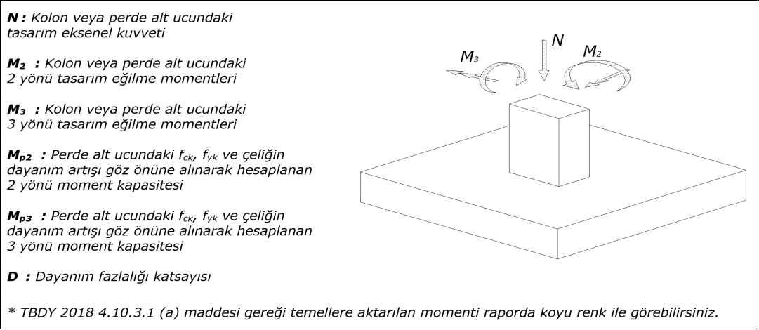 - Temel elemanı tasarım kuvvetleri TBDY 4.10’a göre elde edilir.Detaylı bilgi için bakınız: Temellere Aktarılan Kuvvetler .