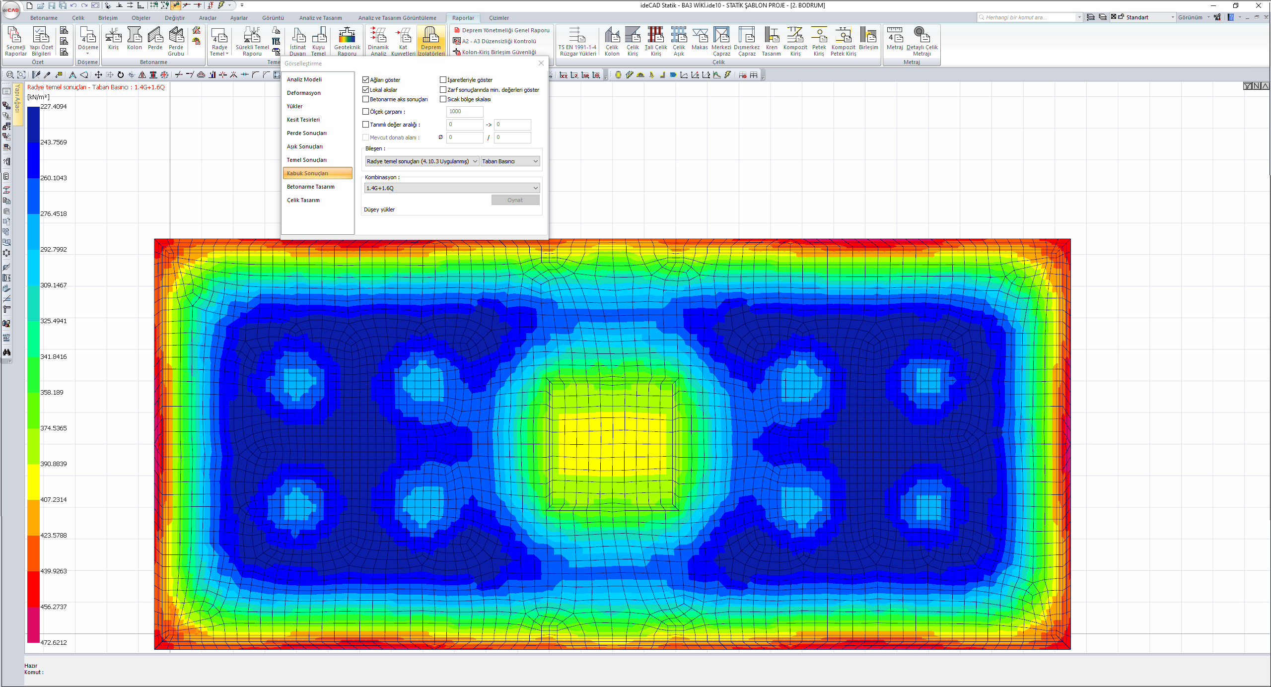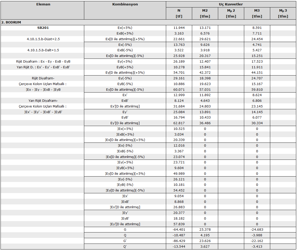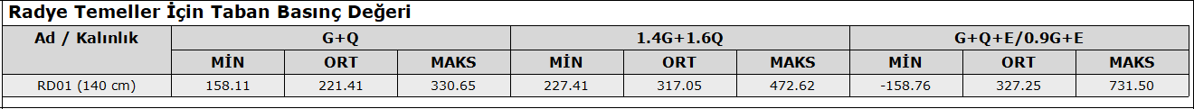 - Binada radye temel kullanılmış ve üst yapı etkileşimli çözüm uygulanmıştır. Radye temel raporunda üst bölümden temele gelen yükler ve hesabı aşağıdaki gibi raporlanır.