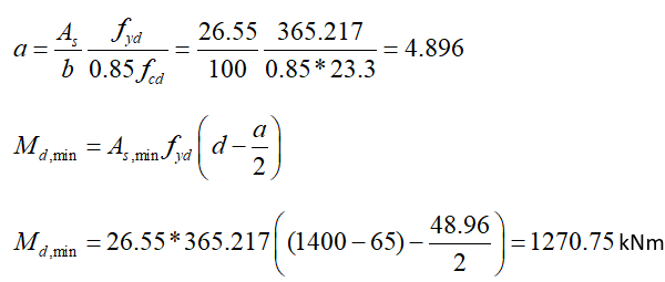- Bu donatı temel plağının her yerinde olması gereken minimum donatıdır. Bu donatıya karşı gelen minimum tasarım momenti Md,min aşağıdaki gibi hesaplanır: