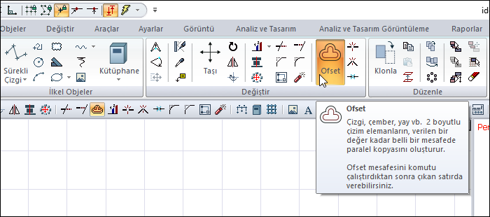 Ofset komutuna ribbon menü Çizimler sekmesi Değiştir başlığı altından ulaşabilirsiniz.