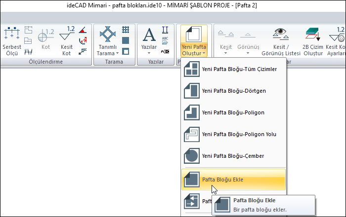 Ribbon menü çizimler sekmesi Pafta Dizaynı başlığı altından ulaşabilirsiniz.