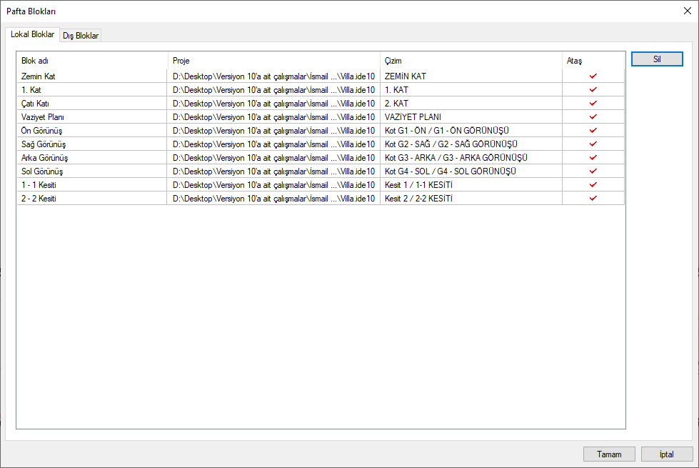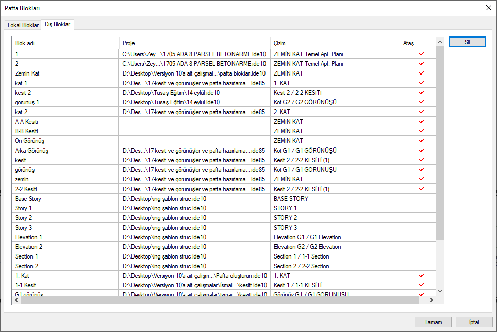 ideCAD’de kaydedilen bloklar listelenir. Farklı projelerden pafta blokları yer alır.
