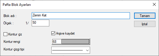 Pafta blok ayarları diyaloğu açılacaktır. Blok adına Zemin Kat yazın. Ölçek değerine 50 girin.