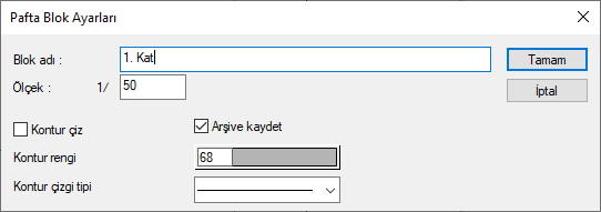 Pafta blok ayarları diyaloğu açılacaktır. Blok adına 1. Kat yazın. Ölçek değerine 50 girin.