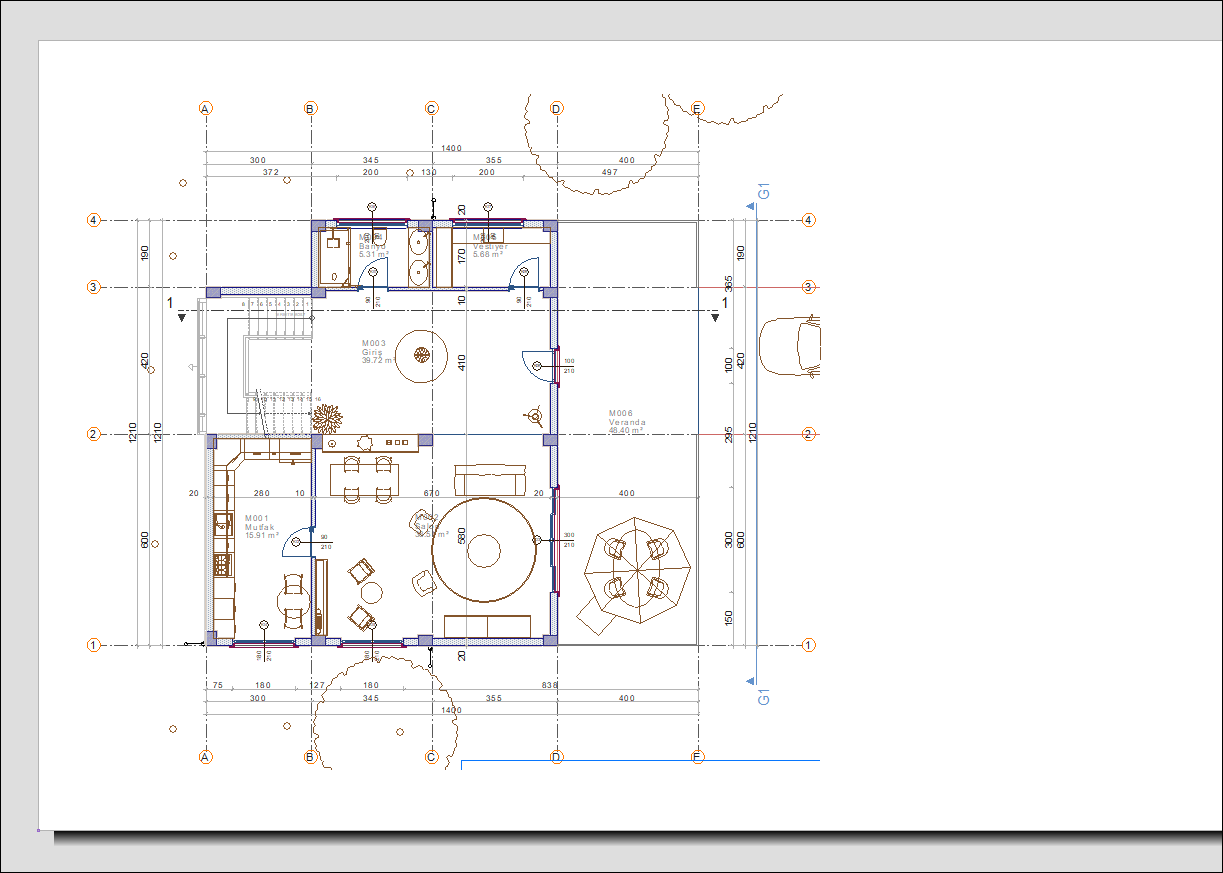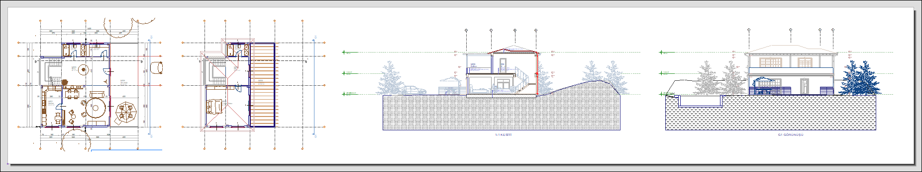 1-1 kesiti ve G1 görünüş pafta bloklarını paftaya ekleyin.