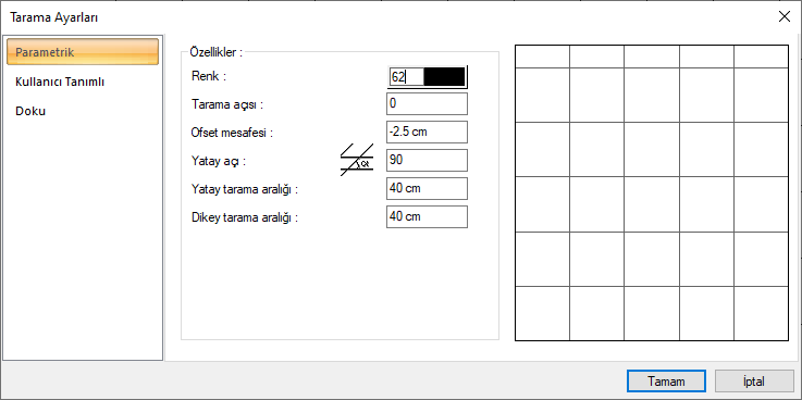 Parametrik Tarama, aralıklı çizgilerin kesiştirildiği tarama tipidir. Çizgiler arası mesafe, açı ve tarama global açısı ayarlanır.