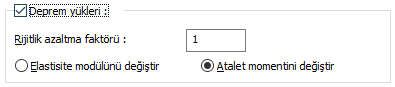 ![]() Perde rijitllikleri, deprem, düşey, rüzgar ve toprak itkisi yüklemeleri için ayrı ayrı belirli bir çapan değeriyle azaltılabilir. Rijitlik azaltması, eleman elastisite modülü ya da atalet momenti bazında seçenekli olarak uygulanabilir. E = AzaltmaFaktörü *E veya I = AzaltmaFaktörü * I olarak uygulanır. |