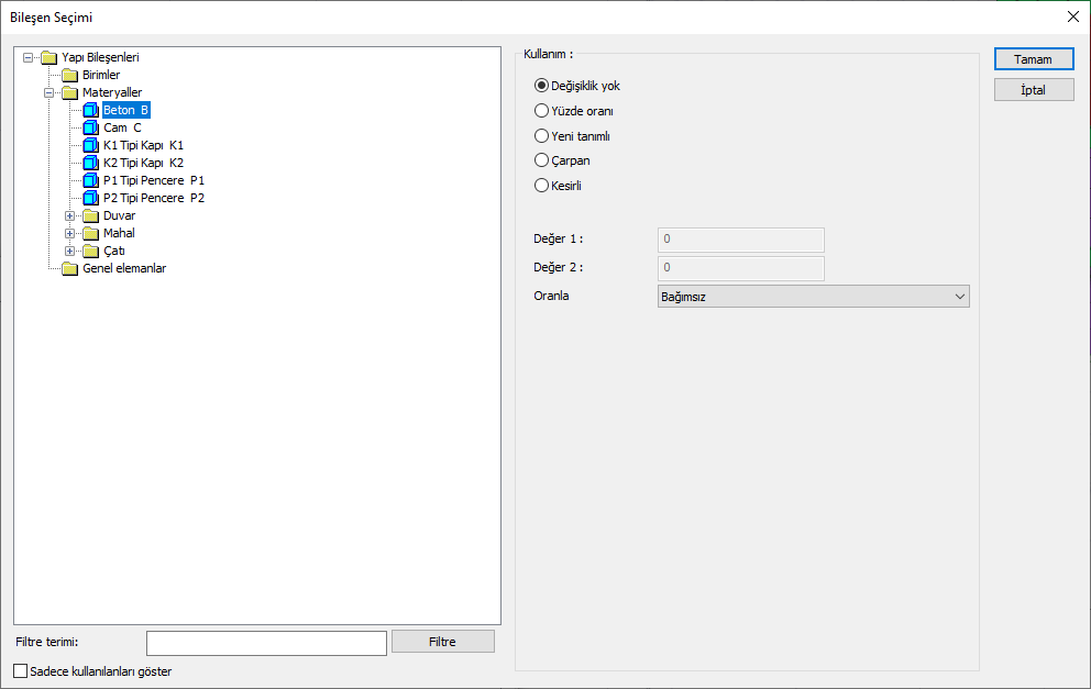 Yapı Bileşenleri Ekle: Detaylı yapı bileşenleri metrajı için tanımlanan yapı malzemelerini objeye atar.