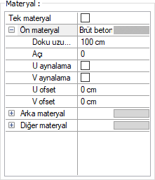 Materyal ![]() Perdenin yüzeylerinde kullanılacak materyal listeden seçilir. Yüzeyler seçilen materyal ile kaplanır ve renderlarda bu şekilde görüntülenir. |