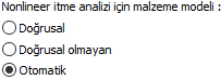 Nonlineer itme analizi için malzeme modeli ![]() Doğrusal, doğrusal olmayan (yayılı plastik davranış) ve otomatik seçeneklerinden biri seçilerek, doğrusal olmayan itme analizi yapılırken perdelerde tanımlanan malzeme modeli belirlenir. |