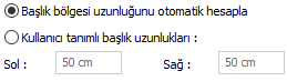 Başlangıç ve bitiş alanı | Malzeme tanımlanırken bulunan alan ölçüsü ile perdenin sol ve sağ tarafta kalan yüzey alanlarının toplamı çarpılarak bulunan değer, malzeme alanı olarak kullanılacak demektir. | |