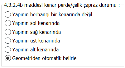 4.3.2.4b maddesi kenar perde/çelik çapraz durumu ![]() TBDY 4.3.2.4(b) maddesinde belirtilen kenar perdelerin devrilme momenti kontrolü yapılırken perdenin durumunu belirlemek için kullanılan seçenektir. Bu koşul otomatik olarak kontrol edilebileceği gibi kullanıcı inisiyatifine de sunulmuştur. |